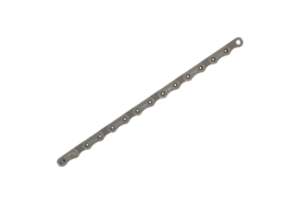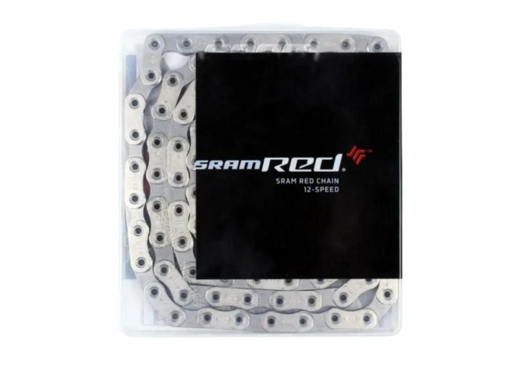 Esta é a corrente de 12v Sram Red®. A tecnologia Flattop™ permite que a corrente seja mais estreita enquanto mantém excelentes características de durabilidade e resistência mecânica. Corrente mais estreita significa mais espaço entre as coroas do cassete em ambos os lados da corrente, tendo assim uma transmissão mais silenciosa. As placas e roletes de Hard Chrome™ reduzem o desgaste e ajudam a corrente a durar mais. O projeto de pinos vazados HollowPin™ também aumenta a eficiência e resistência mecânica.