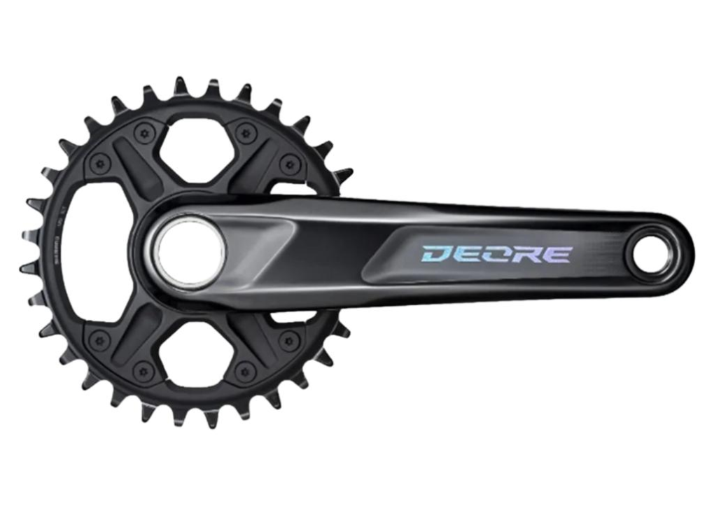 O pedivela SHIMANO DEORE FC-M6100-1 tem uma construção totalmente nova mediante utilização de coroas de montagem direta, um perfil de dentes de engrenagem especial para maior retenção da corrente e um fator Q de 172 mm que é compatível com quadros O.L.D de 142 mm e 148 mm.